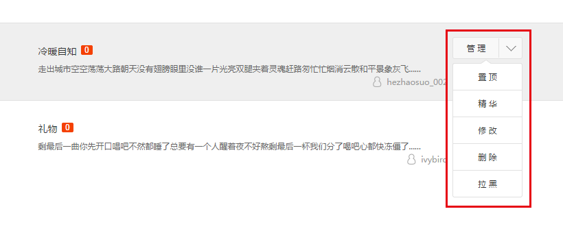 主播和社區(qū)管理員對(duì)主播個(gè)人頁(yè)的帖子具有相同的管理權(quán)限,包括:置頂,精華,修改,刪除,拉黑。