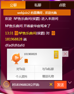 聊天分為公聊和私聊兩種,其中私聊是限制富豪等級(jí)在3富以上的用戶才能使用。