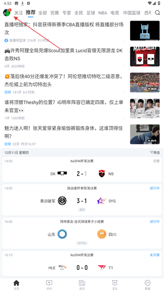 1、打開直播吧App,點擊底部導(dǎo)航欄中間的資訊圖標即可跳轉(zhuǎn)至該頁面。