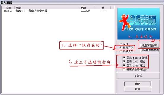 5, 點(diǎn)擊載入游戲后會(huì)出現(xiàn)下面的對(duì)話框,按照?qǐng)D示的設(shè)定設(shè)置好你的模擬器后,首先選“僅存在的”然后在下面的“顯示CPS1游戲” “顯示CPS2游戲” “顯示NEOGEO游戲”三個(gè)選項(xiàng)前打勾,最后點(diǎn)擊“掃描所有游戲”