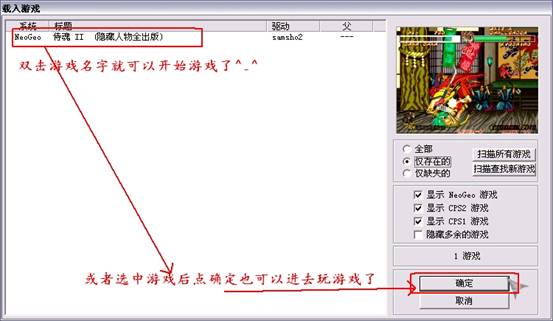 6, 然后左邊的列表會(huì)顯示出來(lái)你已經(jīng)擁有的游戲,選擇一個(gè)(比如:侍魂2),雙擊游戲名字,或者選中游戲后點(diǎn)確定就可以進(jìn)去玩游戲了,^_^~~如圖: