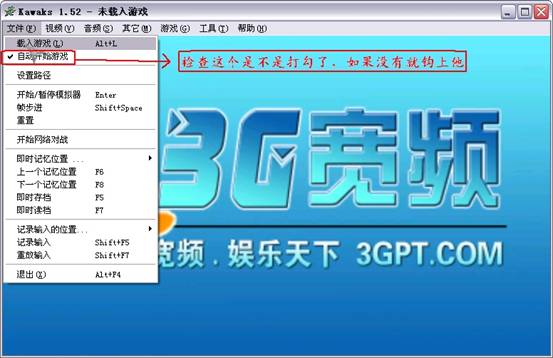 4, 雙擊winkawaks1.52.exe,就是那個(gè)K字形狀的圖標(biāo)^_^~然后點(diǎn)擊文件――載入游戲,而且檢查載入游戲下面的“自動(dòng)運(yùn)行游戲”是不是打勾了,如果沒有就鉤上他,如圖: