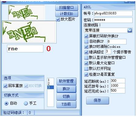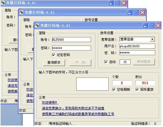 然后點下多開器最上面的“掃描窗口”這時三個打碼窗口全部導(dǎo)了進去,軟件管理旁邊會出現(xiàn),意思當前有三個打碼窗口。再在打碼器右側(cè)最上面的下面的賬號輸上自己寬帶賬號,密碼輸上自己的寬帶密碼,連接線路選擇“寬帶連接”其他設(shè)置如下圖: