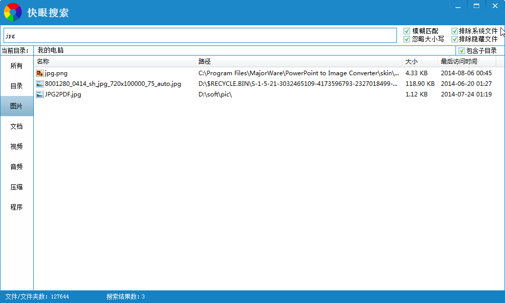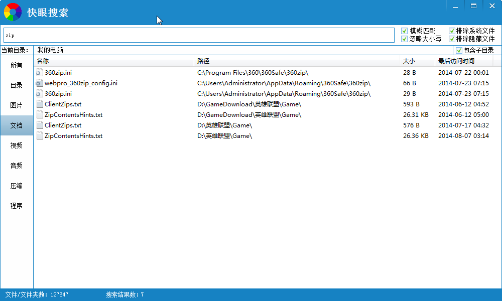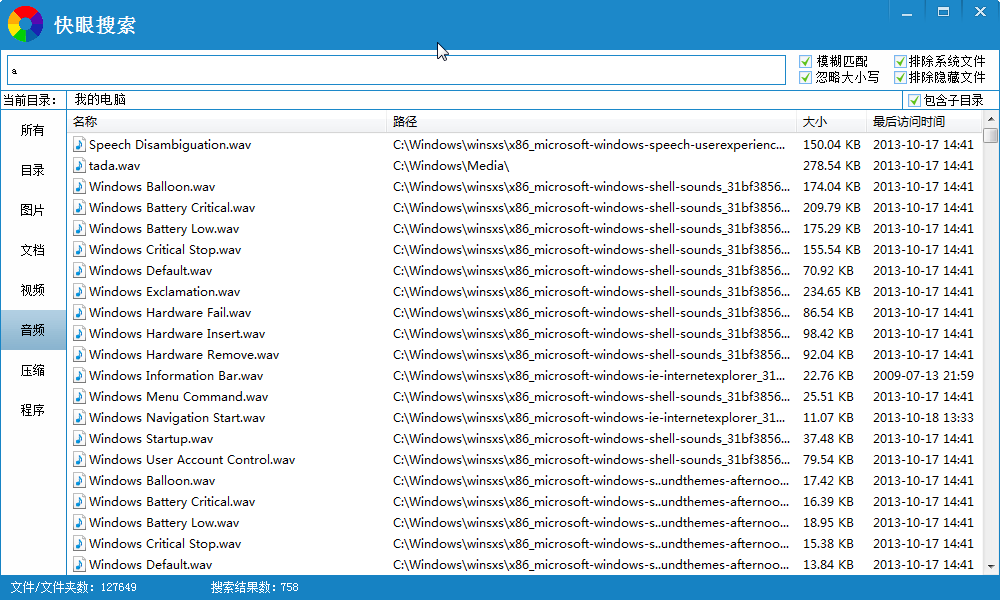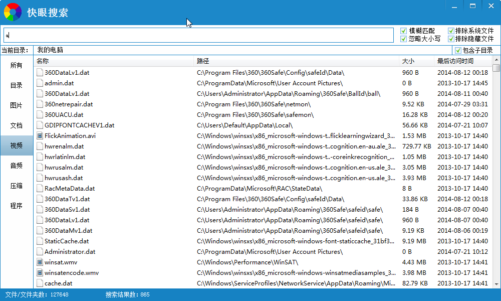 快眼文件搜索是一款可以支持通配符模糊查詢(xún)、多種過(guò)濾方式、多種排序方式,為您帶來(lái)急速的搜索體驗(yàn)的快速文件搜索軟件??煅畚募阉鞑僮骱?jiǎn)單快捷且占用資源少。并且還可以快速搜索電腦中的圖片、文檔、視頻、音頻、壓縮文件、程序等。如此方便的軟件,趕快下載體驗(yàn)吧!??!