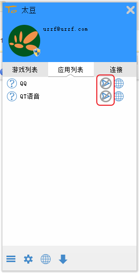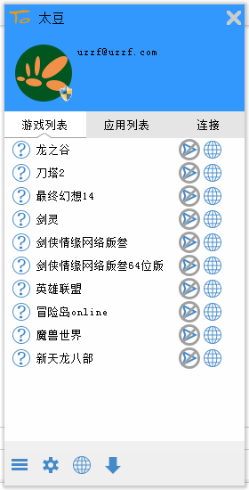 太豆客戶端是一個(gè)非常受歡迎的游戲輔助工具,簡單地說就是虛擬應(yīng)用映射,使用它你就可以把qq之類的軟件映射到游戲中,這樣玩家不用出游戲,就能使用QQ、QT語音等軟件,方便玩家在游戲的同時(shí)跟其他玩家交流,邊聊天,邊游戲需要注意的是不是每款游戲都支持太豆,玩家們可以在列表中查看支持的游戲