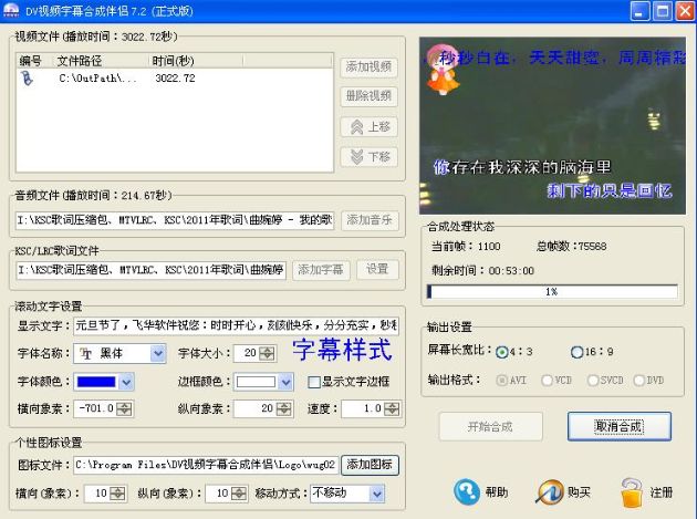 飛華DV視頻字幕合成伴侶是飛華軟件官方開發(fā)的一款視頻編輯軟件,該軟件非常的人性化,你可以使用它配自己喜歡的音樂,實(shí)現(xiàn)在視頻圖像中顯示音樂相應(yīng)的卡拉OK字幕和流行字幕樣式制作成MTV視頻,自由設(shè)置字幕的顏色、大小、字體等,而且還可以給視頻圖像上加入您的個(gè)性Logo圖標(biāo),配上動(dòng)感的滾動(dòng)字幕注釋,實(shí)現(xiàn)DIY(自制)自己的創(chuàng)意視頻。