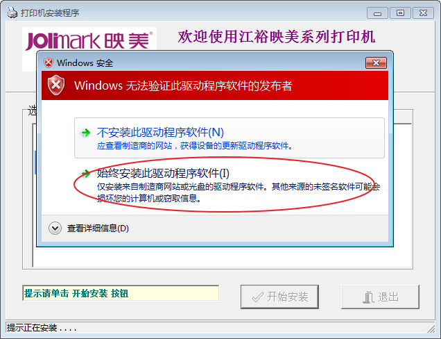 下載解壓后,在文件夾根目錄下找到Setup.exe文件,雙擊打卡會(huì)出現(xiàn)如上圖所示界面,然后點(diǎn)擊開始安裝,會(huì)彈出對(duì)話框,點(diǎn)擊“是”即可,然后,系統(tǒng)會(huì)彈出Windows安全的對(duì)話框,點(diǎn)擊下面紅圈標(biāo)注的地方,可繼續(xù)進(jìn)行驅(qū)動(dòng)安裝,如點(diǎn)擊上面的,則驅(qū)動(dòng)安裝程序會(huì)被終止。安裝完成后連接上打印機(jī)方可使用。此驅(qū)動(dòng)為官方版,請(qǐng)放心安裝。