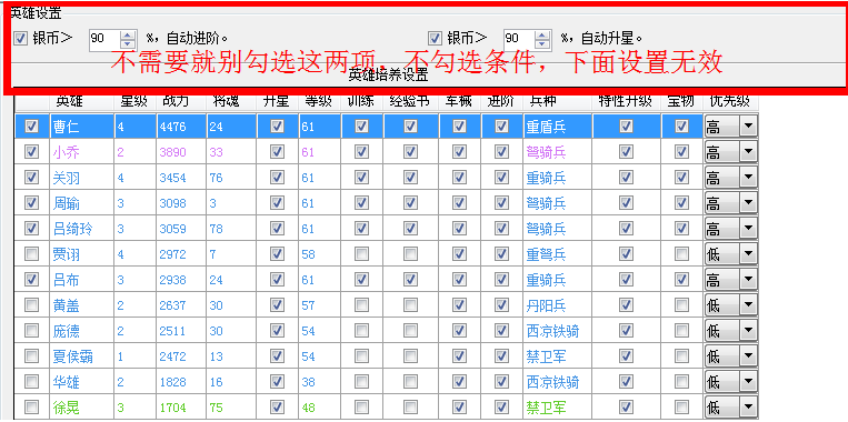 b.把需要培養(yǎng)的武將設置優(yōu)先級為高,這樣的話其他的武將設置升星和進階基本也沒意義了,沒有銀幣可以執(zhí)行此操作。: