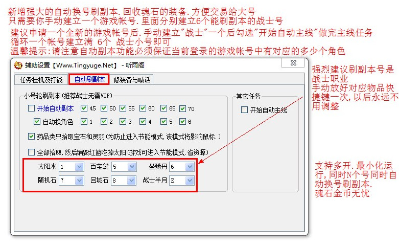 聽雨閣武尊輔助是專為頁游《武尊》打造的輔助工具。主要功能包括K加血,快速買藥,自動任務(wù),掛機升級,自動挖礦,超速功勛交易,羽毛兌換綁金等功能,是你玩《武尊》的必備神器??!