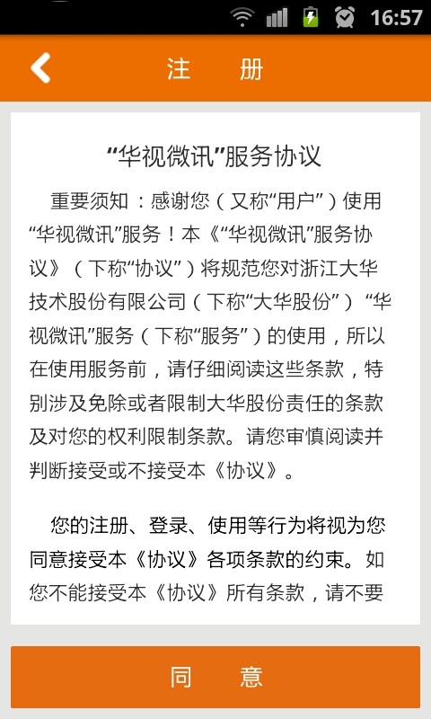 在登錄界面點(diǎn)擊【注冊(cè)】按鈕,進(jìn)入華視微訊服務(wù)協(xié)議;
