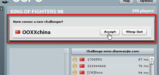 如果接到其他玩家對戰(zhàn)邀請時,點“Accept”接受對戰(zhàn),點“Wimp out”拒絕對戰(zhàn),如下圖: