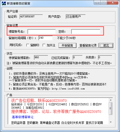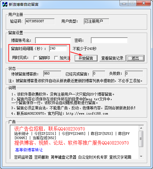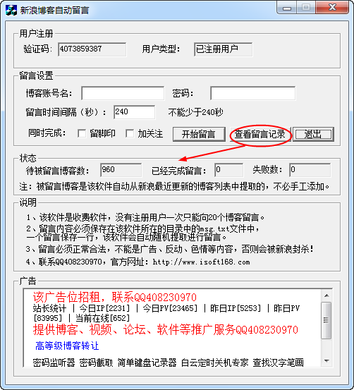 新浪博客自動留言是一款用于給博客刷留言的工具,該軟件的目的是幫助推廣你的博客。軟件既可以幫自己的博客刷留言,也可以幫別人刷留言,幫別人刷留言的話,會提供回訪機會,更容易增加自己博客的人氣。