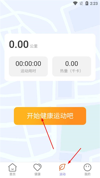 3、進(jìn)入運(yùn)動頁面,點(diǎn)擊開始健康運(yùn)動吧可記錄運(yùn)動里程、運(yùn)動用時、消耗熱量等數(shù)據(jù)。
