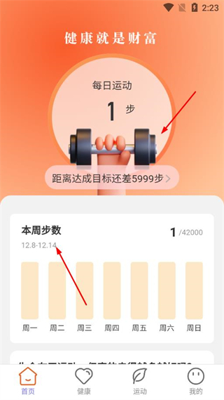 1、在首頁可查看每日運(yùn)動步數(shù)、本周步數(shù)統(tǒng)計,還能看到距離目標(biāo)步數(shù)的進(jìn)度,直觀了解運(yùn)動完成情況。