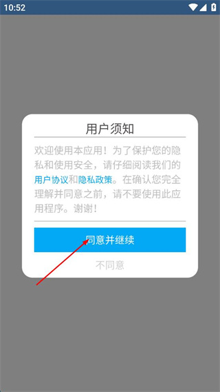1、打開投屏軟件后,在彈出的用戶須知彈窗中,點擊同意并繼續(xù)按鈕,進入主界面。