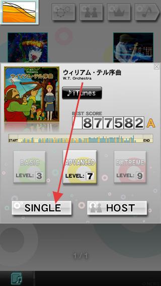 2、在歌曲頁(yè),點(diǎn)“SINGLE”(單人模式),選“ADVANCED(LEVEL:7)”難度,開(kāi)始演奏。