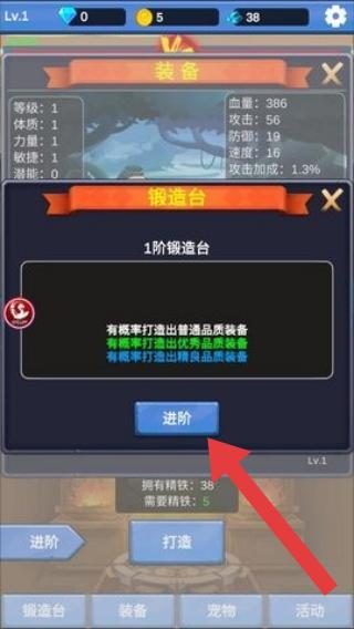 1、顯示角色等級(jí)為L(zhǎng)v.1,有裝備屬性(血量、攻擊等),還有“1階鍛造臺(tái)”及“進(jìn)階”功能,涉及消耗精鐵等資源,可概率打造不同品質(zhì)裝備。