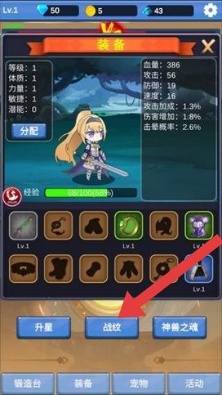 2、畫(huà)面中顯示角色等級(jí)為L(zhǎng)v.1,有角色屬性信息,下方有“升星”“戰(zhàn)紋”“神獸之魂”等功能按鈕,還展示了角色裝備欄。