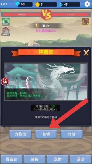 3、顯示為第1關(guān),正在挑戰(zhàn)BOSS,副本等級(jí)要求150級(jí),有“寵物島”“首領(lǐng)”“對(duì)戰(zhàn)”等功能按鈕,還涉及挑戰(zhàn)次數(shù)及獎(jiǎng)勵(lì)(神獸之魂、神獸丹)。
