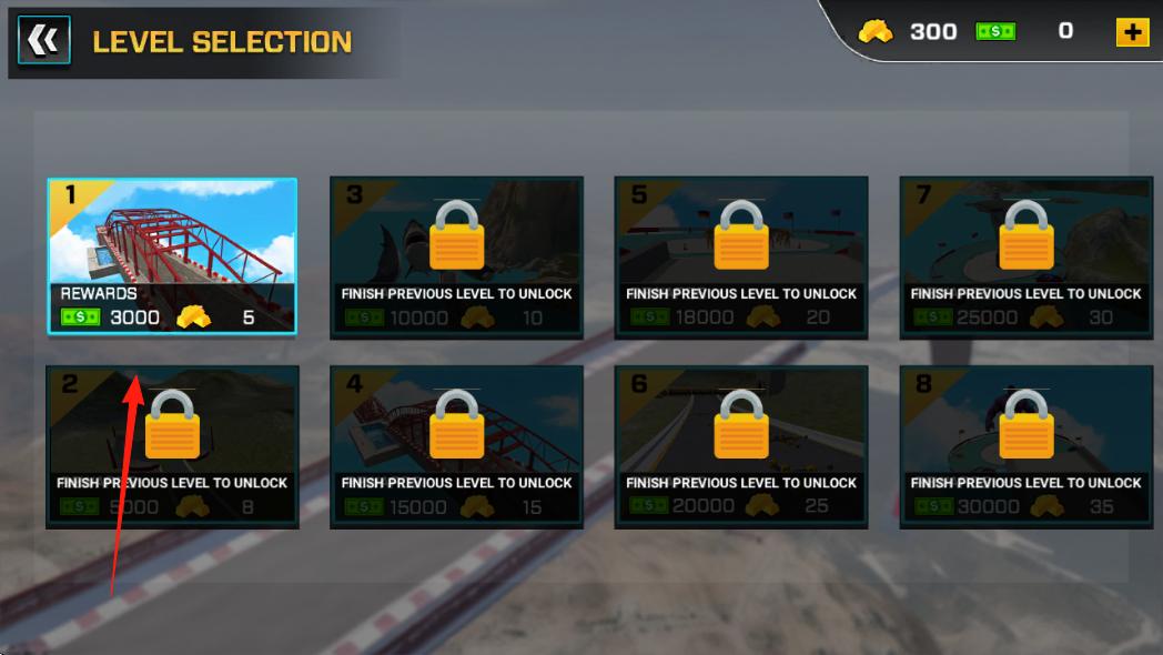 1、在選關(guān)界面,點擊“1”號關(guān)卡(箭頭指向),進入橋梁賽道,準備挑戰(zhàn)。
