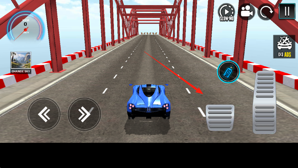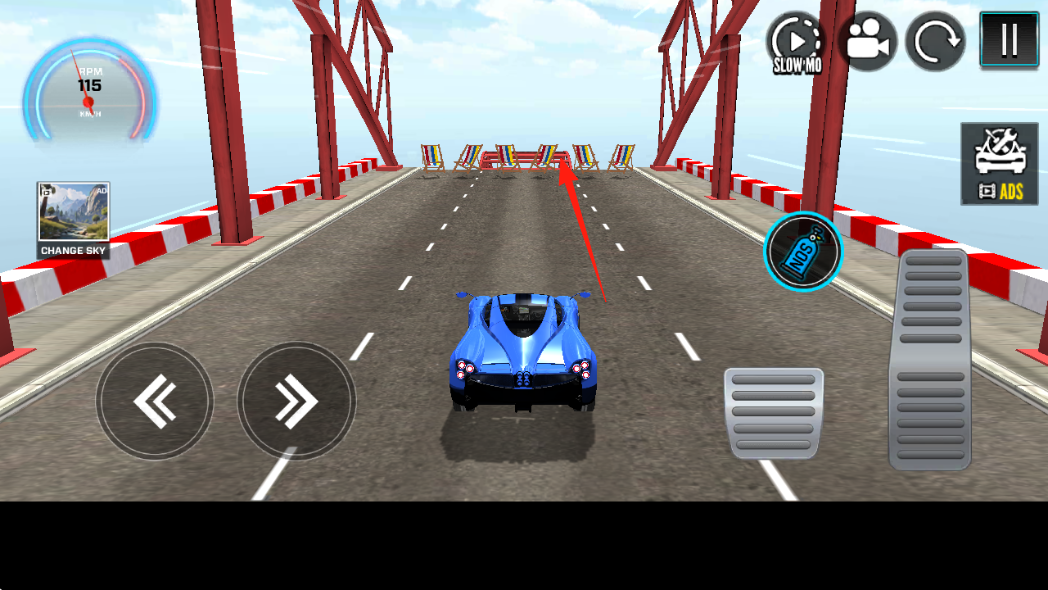 2、操控藍色賽車,點擊箭頭指向的剎車油門按鍵,沿橋梁賽道行駛,控制車速。