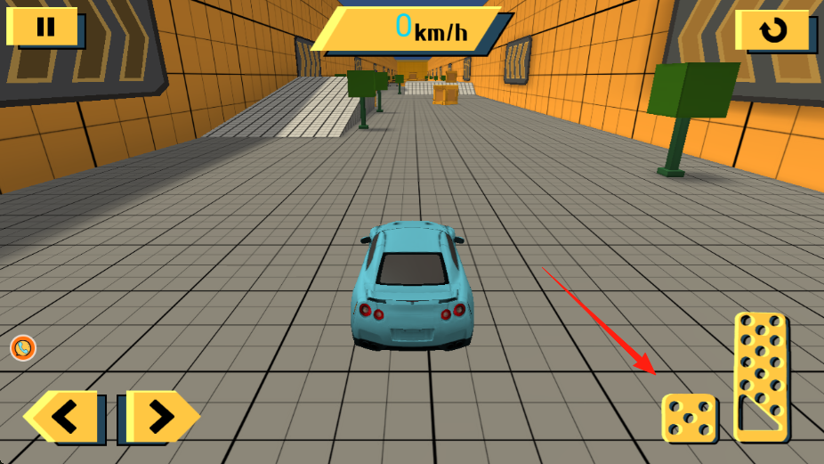 1、進(jìn)入賽道,點(diǎn)擊箭頭指向的加速按鍵,啟動(dòng)藍(lán)色賽車,熟悉前進(jìn)、轉(zhuǎn)向操作。