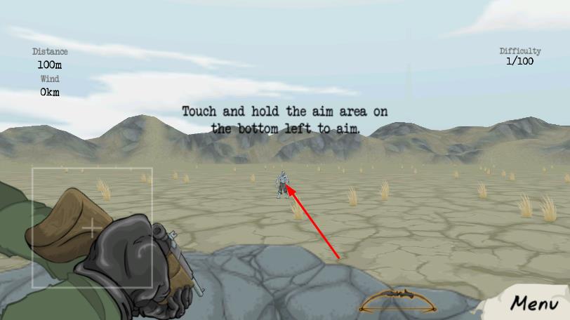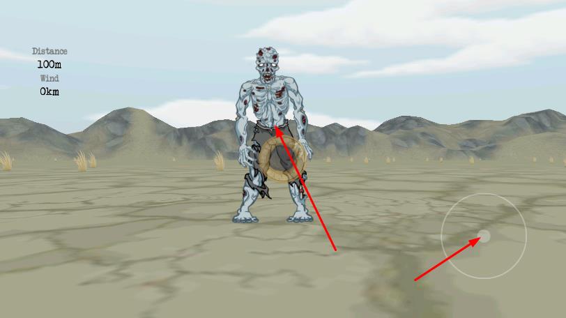 1、觸摸并按住左下角瞄準(zhǔn)區(qū)域,進(jìn)行瞄準(zhǔn)操作,對準(zhǔn)遠(yuǎn)處目標(biāo)。
