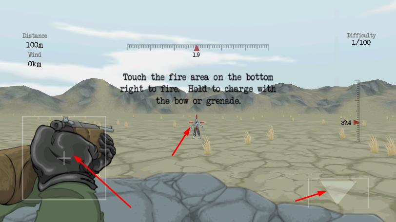 2、點(diǎn)擊右下角射擊區(qū)域開火,長按可蓄力,用弓箭或手雷攻擊目標(biāo)。