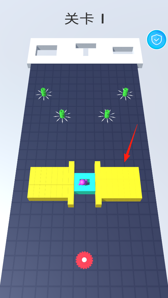 1、進(jìn)入關(guān)卡1,觀察紫色角色與黃色方塊布局,移動方塊搭建路徑,借助方塊移動機(jī)制,讓角色避開尖刺,通過操作,規(guī)劃行進(jìn)路線,感受空間解謎的基礎(chǔ)樂趣。