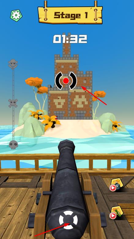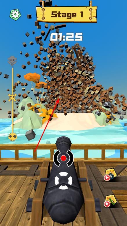 2、通過點擊大炮炮口處的準星圖標,調(diào)整瞄準方向,瞄準遠處海島上的堡壘,調(diào)整好瞄準方向后,點擊發(fā)射按鈕,發(fā)射炮彈攻擊堡壘。