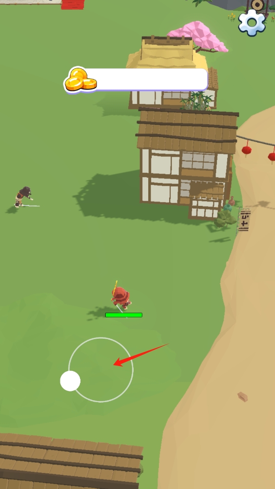 1、在關(guān)卡界面,通過(guò)左側(cè)搖桿控制角色移動(dòng),在日式場(chǎng)景中探索,收集金幣,推進(jìn)關(guān)卡進(jìn)度。