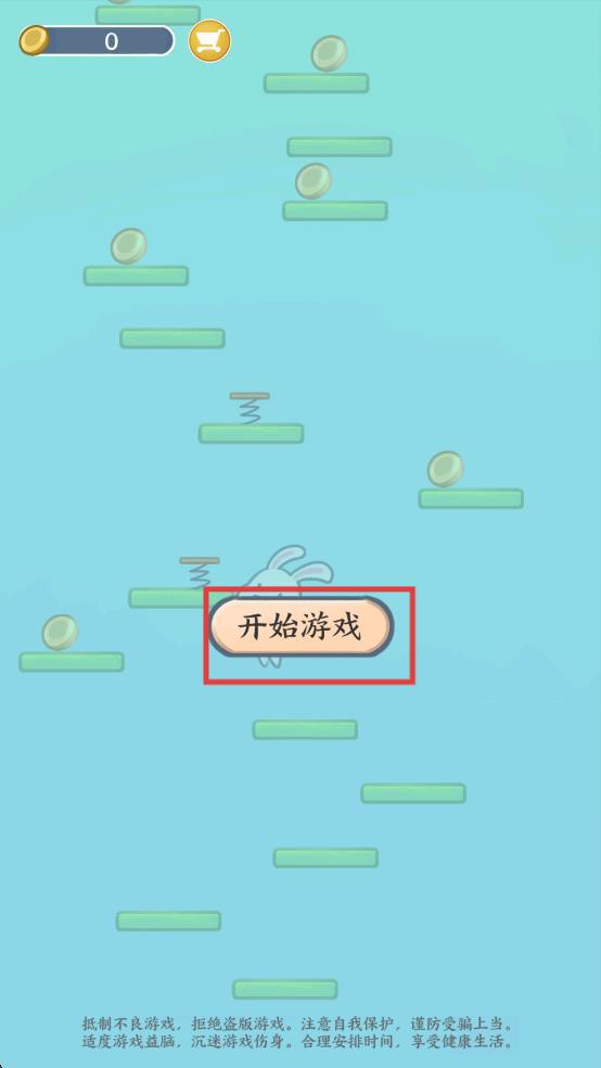1、首先我們點(diǎn)擊開始游戲按鈕,操控兔子在綠色平臺(tái)跳躍,注意彈簧、金幣分布,借彈簧跳更高,多吃金幣。
