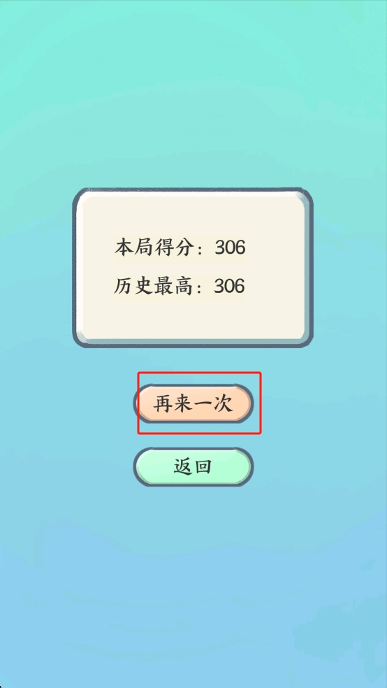 3、一局結(jié)束后會(huì)顯示本局的分?jǐn)?shù),若想刷新分?jǐn)?shù),點(diǎn)擊再來一次按鈕重啟挑戰(zhàn),想回到初始界面,點(diǎn)返回按鈕即可。