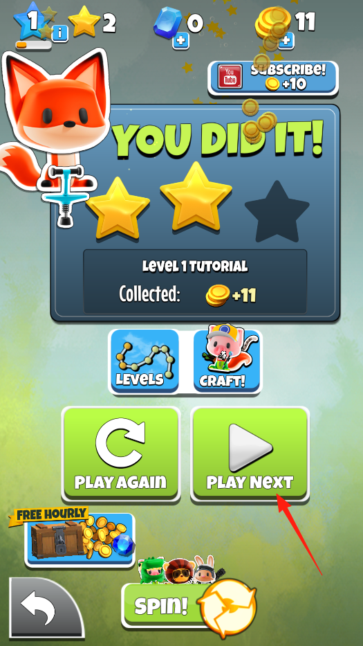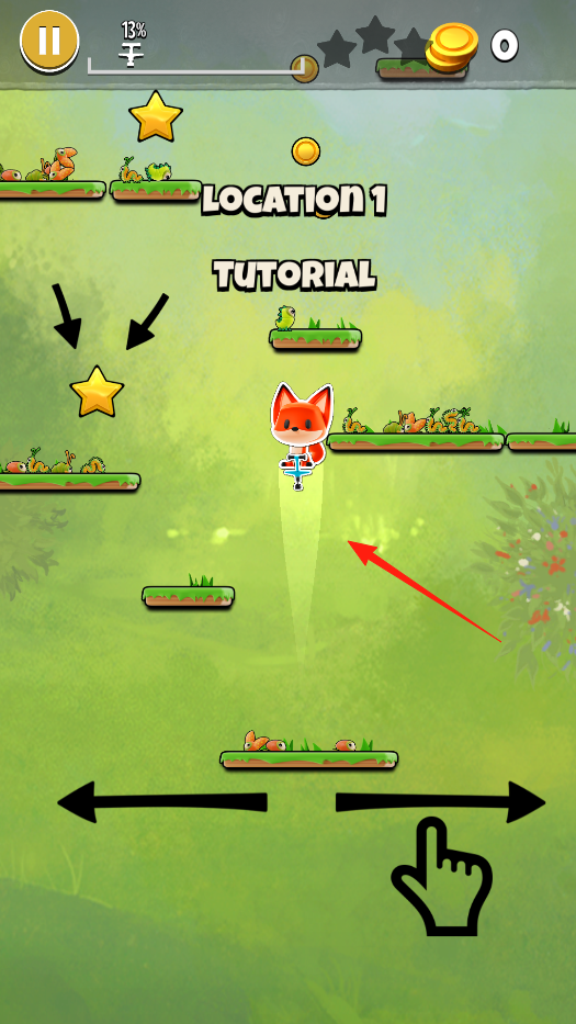 2、操控狐貍左右移動(dòng),在跑道跳躍,收集星星金幣,避開障礙,完成教程挑戰(zhàn),體驗(yàn)平臺(tái)跳躍玩法。