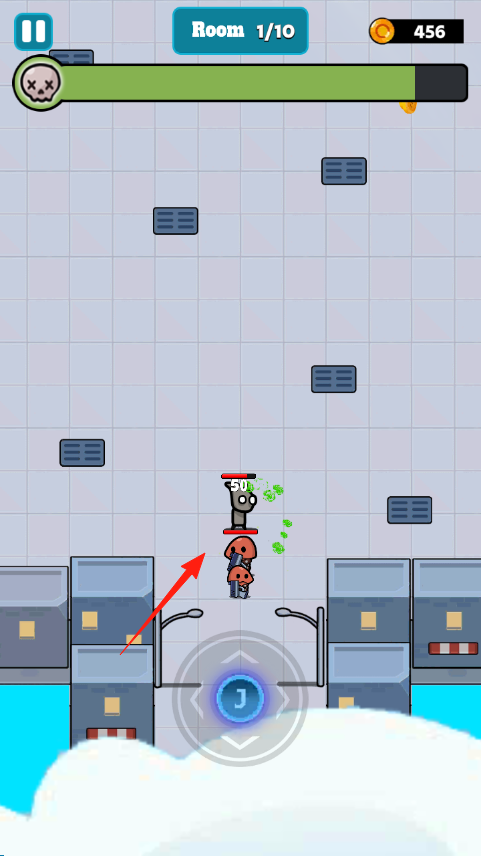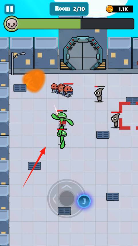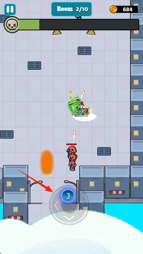 1、進入游戲后到房間的關(guān)卡,用虛擬搖桿移動角色,靠近怪物自動射擊綠色彈道。