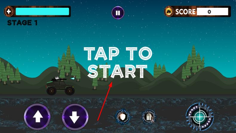 1、進(jìn)入游戲,在初始界面,點(diǎn)擊TAP TO START開始,進(jìn)入場(chǎng)景后,點(diǎn)擊屏幕左下角向上的箭頭按鈕,控制吉普車前進(jìn)。