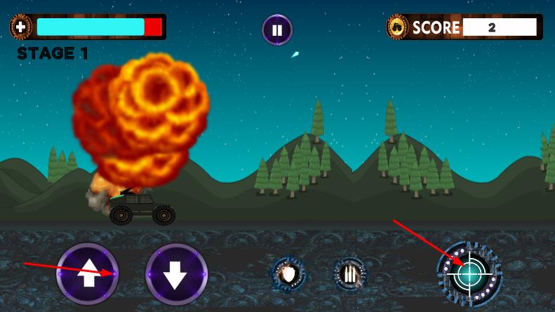 2、在前進(jìn)過程中,會(huì)遇到各種危險(xiǎn),點(diǎn)擊右下角瞄準(zhǔn)鏡的按鈕,進(jìn)行攻擊,抵御危險(xiǎn),屏幕右上角分?jǐn)?shù)會(huì)隨著攻擊成功而增加。