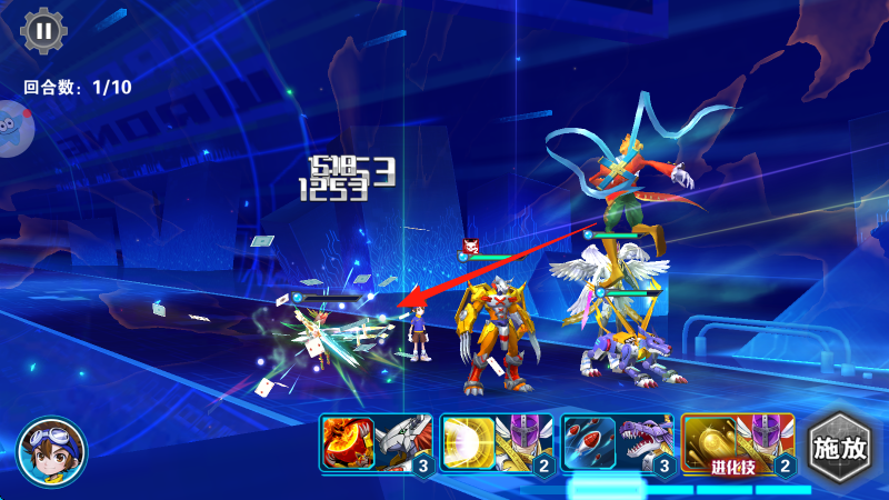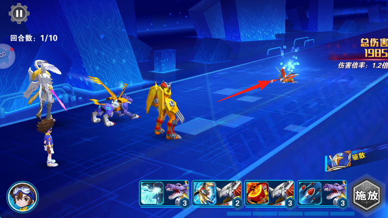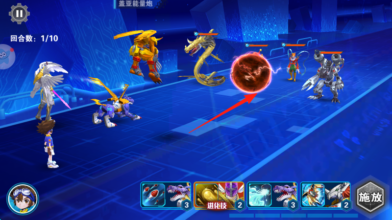 1、戰(zhàn)斗開始,選擇數(shù)碼寶貝技能如畫面下方技能欄,瞄準敵方釋放紅色箭頭指引目標。