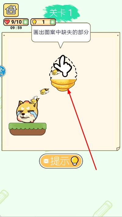 2、在場(chǎng)景中,根據(jù)提示畫(huà)出圖案中缺失的部分 ,使用手指在屏幕上拖動(dòng),畫(huà)出合適的線條,保護(hù)小狗,避免小狗被蜜蜂蜇住。