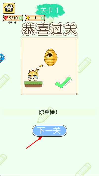 3、在畫(huà)線過(guò)程中,合理規(guī)劃線條的路徑,確保小狗在規(guī)定時(shí)間內(nèi)不被蜜蜂蟄咬,成功保護(hù)小狗,點(diǎn)擊下一關(guān)按鈕。