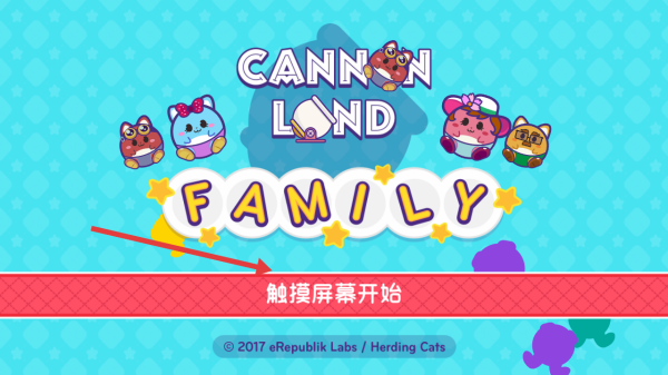 1、觸摸屏幕,進入Cannon Land Family關卡,操控貓咪大炮,瞄準上方炮臺,發(fā)射彈射過障礙。