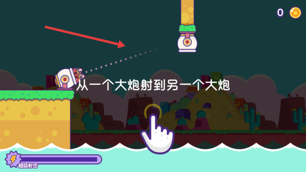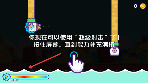 2、借拋物線軌跡,讓貓咪從一個炮臺射至另一個,跨越河流地形,觸發(fā)超級射擊時,長按屏幕充能。