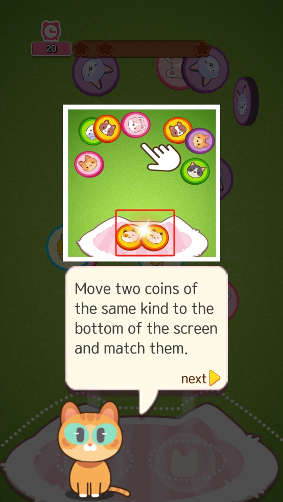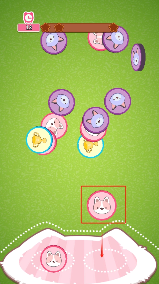 2、屏幕上方有多種圖案的硬幣,需識別出與下方粉色區(qū)域內相同圖案的硬幣,將其拖動到對應空位,達成消除條件。