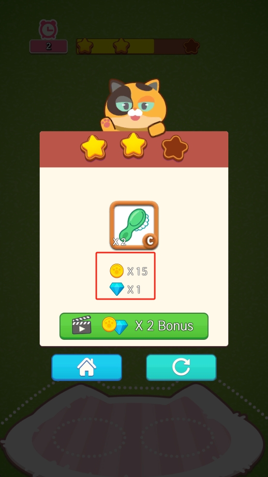 3、成功完成消除后,彈出獎勵界面,可獲得15個金幣、1個鉆石及道具,點擊藍色房子按鈕返回主頁。
