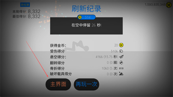 4、游戲結(jié)束后,根據(jù)空中停留時(shí)間、受傷、翻轉(zhuǎn)等情況結(jié)算分?jǐn)?shù),若刷新紀(jì)錄可獲得金幣獎(jiǎng)勵(lì),之后可選擇返回主界面或再玩一次。
