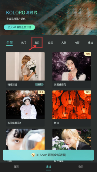 2、在濾鏡選擇頁面,點(diǎn)擊膠片分類,進(jìn)入膠片濾鏡列表頁。