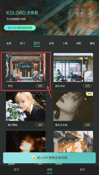 3、在膠片濾鏡列表里,選擇懷舊濾鏡條目,進(jìn)入濾鏡詳情頁。