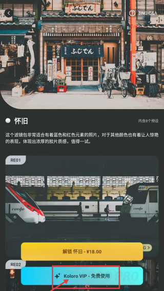 4、在濾鏡詳情頁,點(diǎn)擊Koloro-VIP-免費(fèi)使用按鈕,使用該懷舊濾鏡。