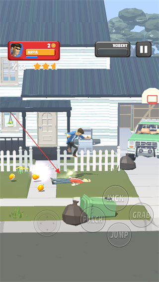 1、在居民區(qū)場(chǎng)景中,操控角色移動(dòng),利用攻擊按鈕如PUNCH與敵人戰(zhàn)斗,注意上方血條和等級(jí)。