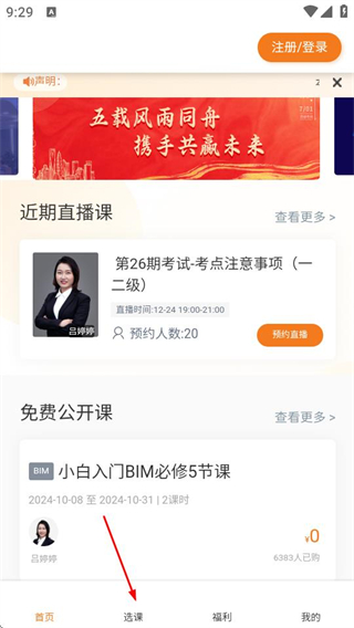1、在小筑教育首頁,點擊底部的選課選項,進入選課頁面。